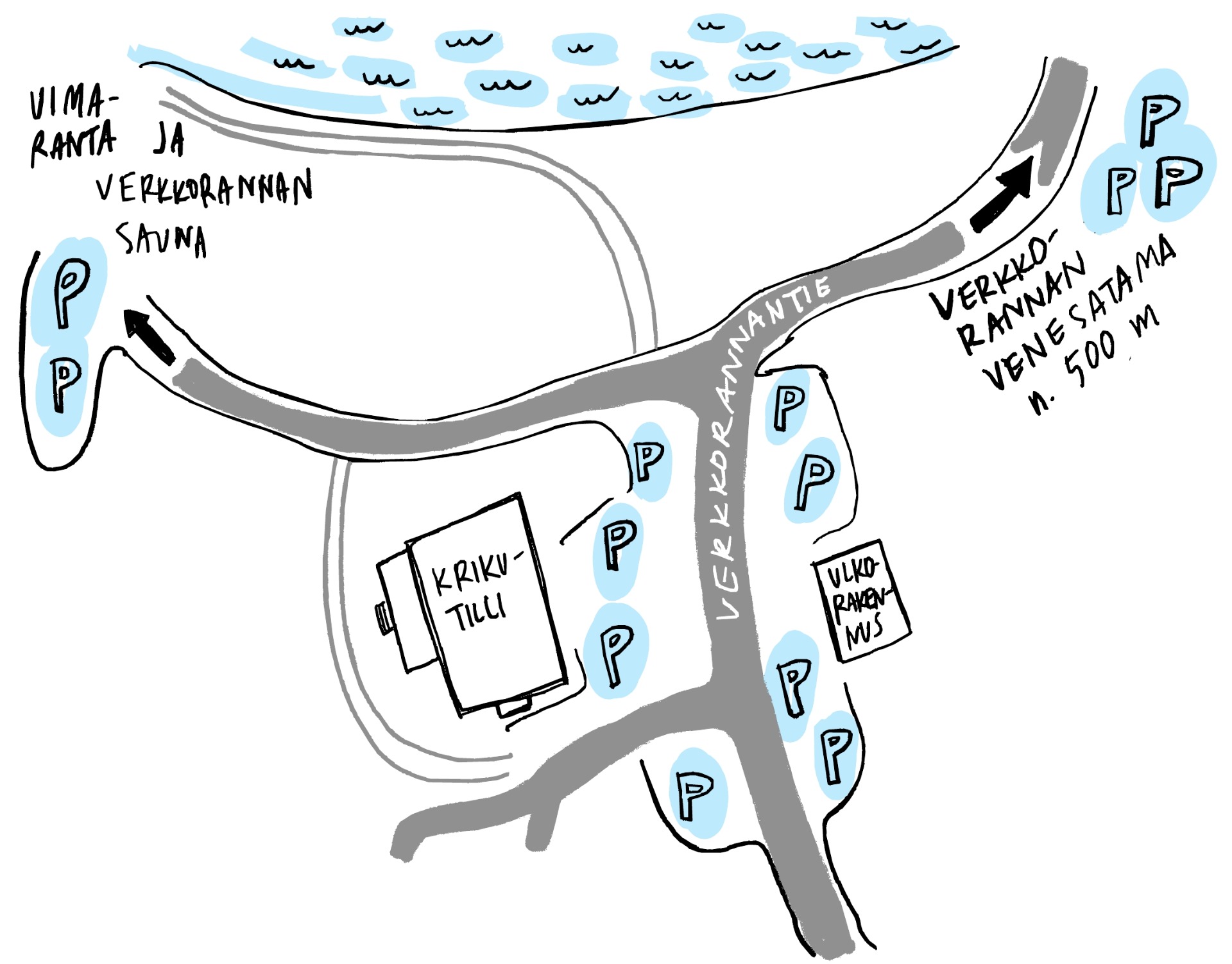 Pysäköintipaikat sijaitsevat talon edessä, rantasaunan takana tai Verkkorannan venesatamassa. Naapurien pihoihin tai pihoille johtaville teille pysäköinti on kielletty.